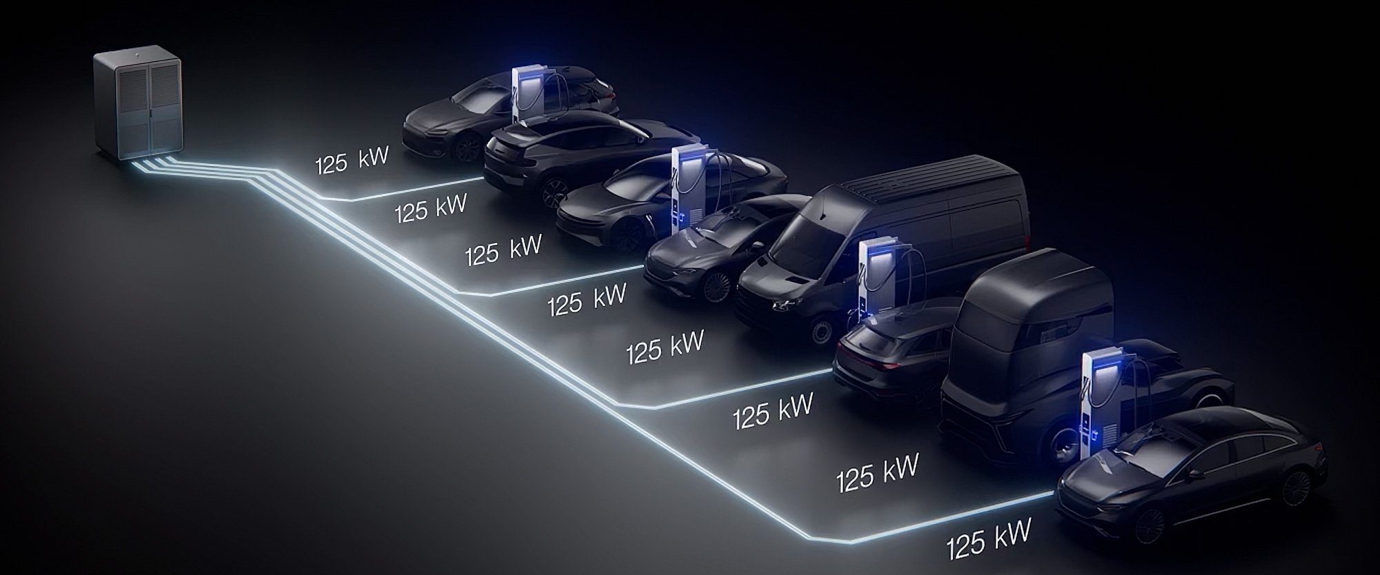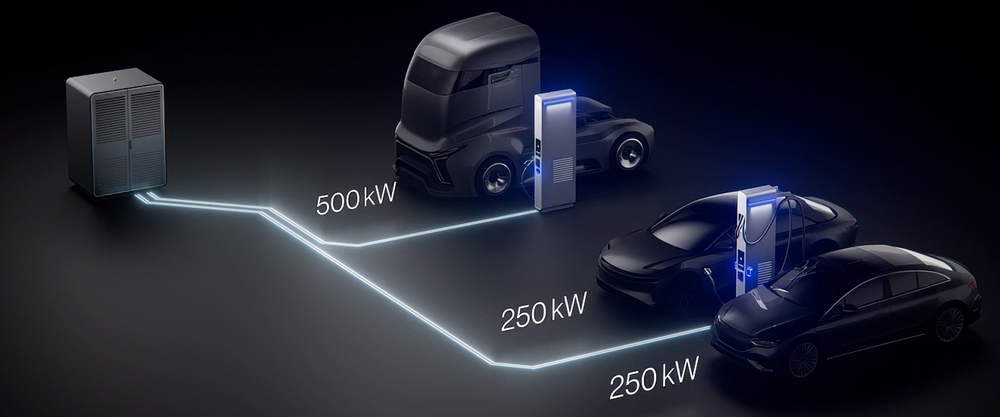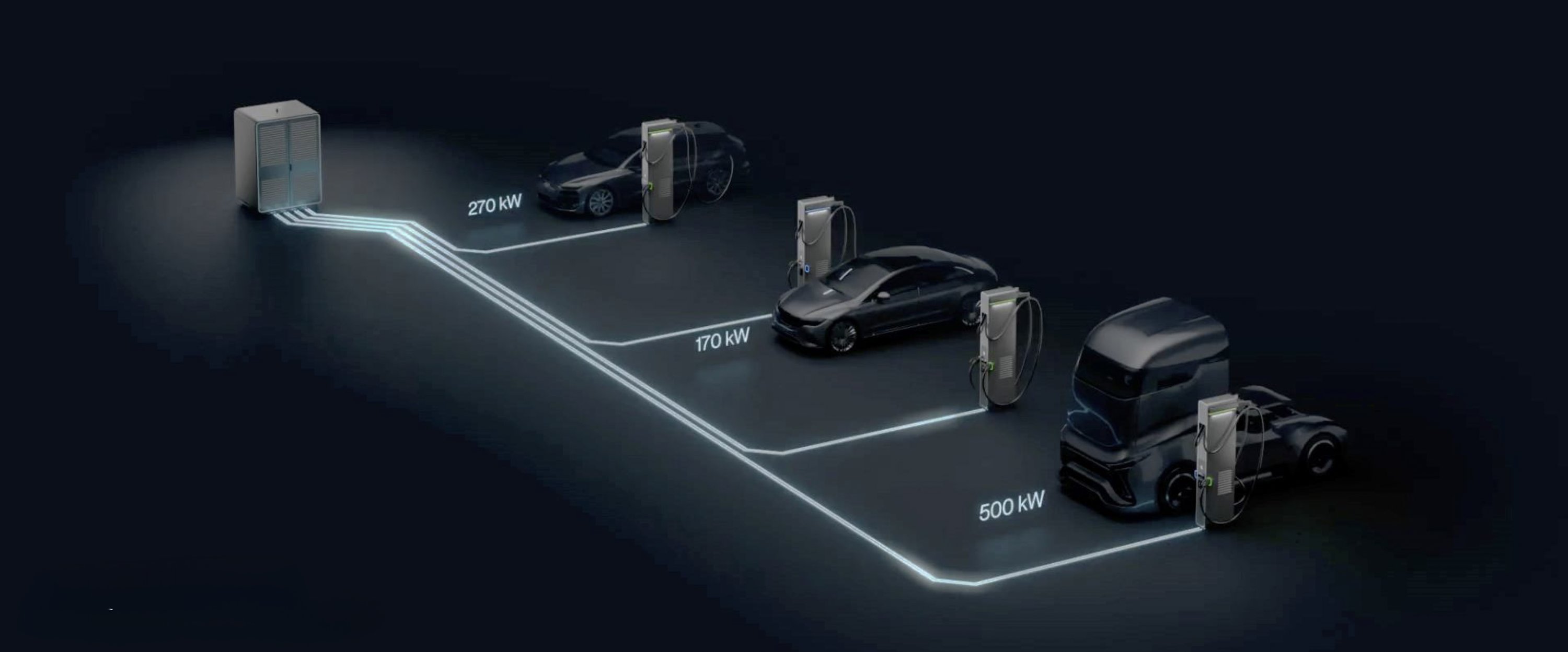 Die ChargeBox ermöglicht Ultra-Schnellladen mit bis zu 320 kW, selbst an leistungsbegrenzten Netzanschlüssen.