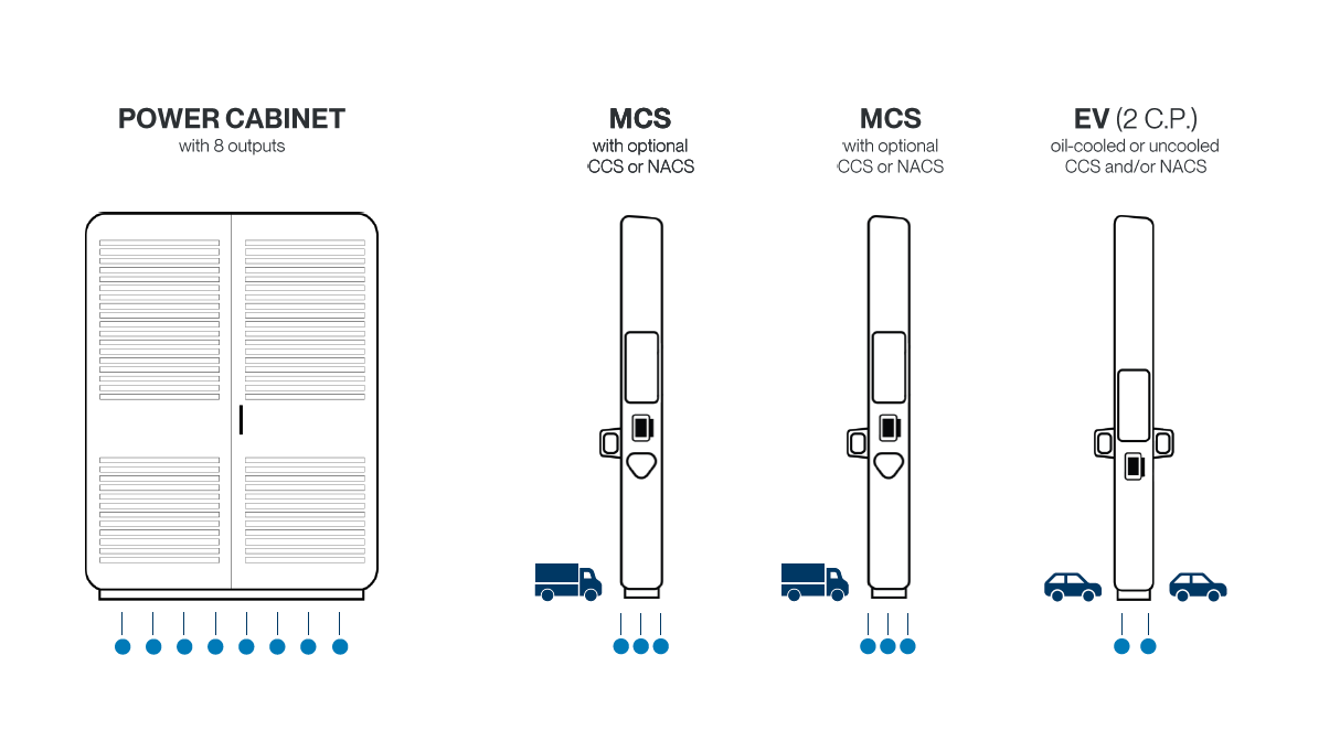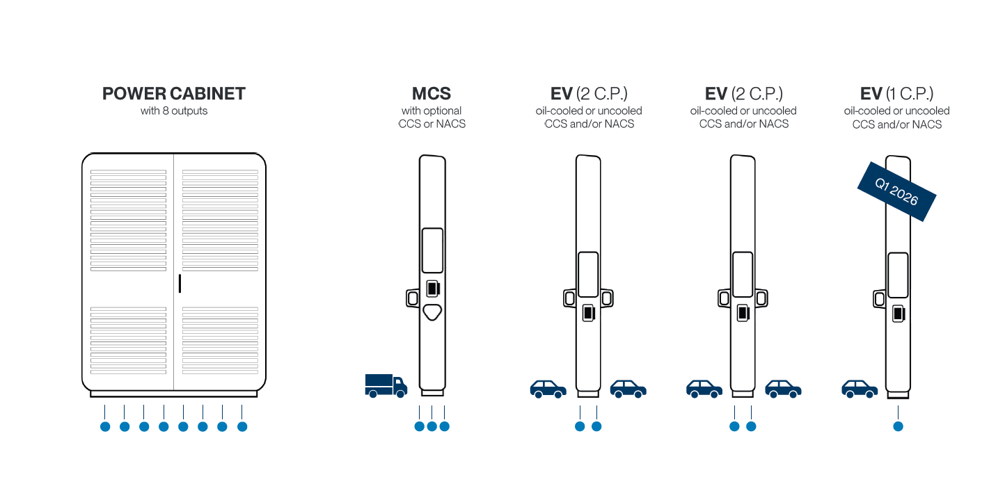 - Verschiedene Kabellängen (3,2 Meter und 5,6 Meter) mit CCS2-Stecker, optional mit Kabelmanagementsystem