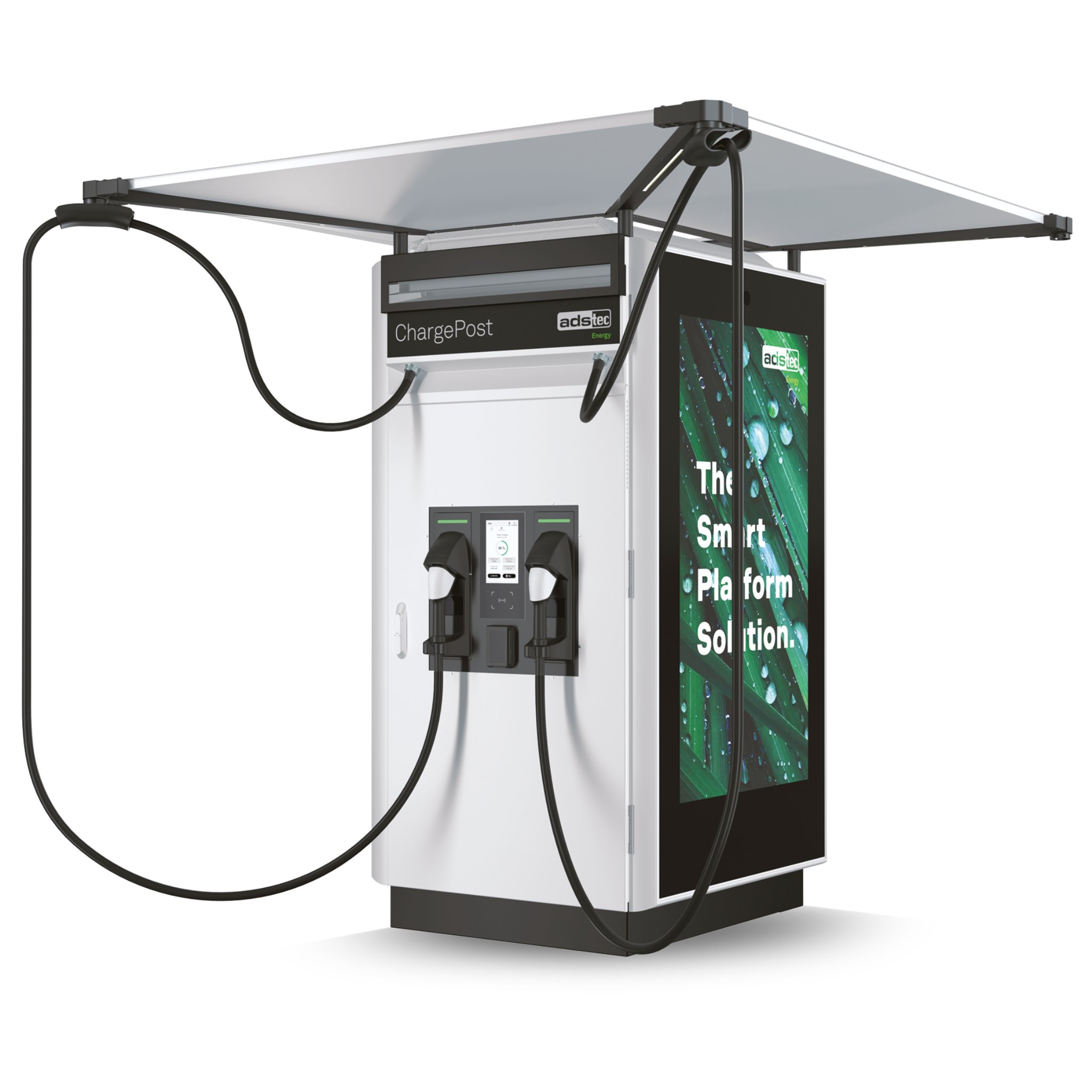 Der ADS-TEC Energy ChargePost ist eine kompakte Schnellladelösung mit integriertem Batteriespeicher. Entwickelt für Ladeanforderungen in Städten, an Verkehrsknotenpunkten, bei Stadtwerken, Energieversorgern oder im gewerblichen Umfeld, kombiniert sie ultraschnelles DC-Laden mit moderner Werbetechnik – und das auf minimalem Raum.