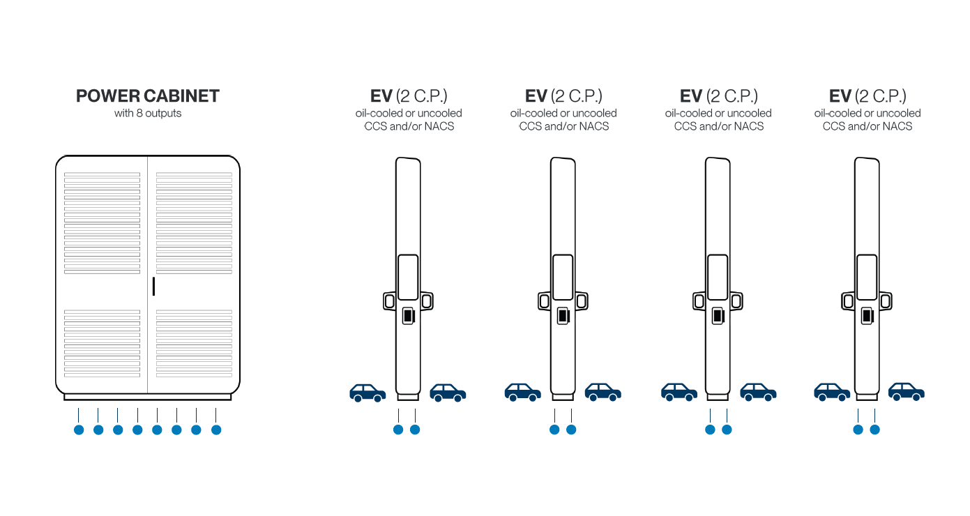 Der ChargePost bietet eine Ladeleistung von bis zu 300 kW für ein Fahrzeug oder 2 × 150 kW bei gleichzeitiger Nutzung beider Ladepunkte.